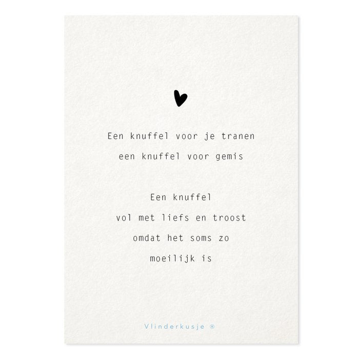 Geef dit kaartje aan iemand die troost, liefde, dikke knuffel of een hart onder de riem kan gebruiken. Of gebruik dit kaartje om bij een foto/kaarsje te zetten op de kast.