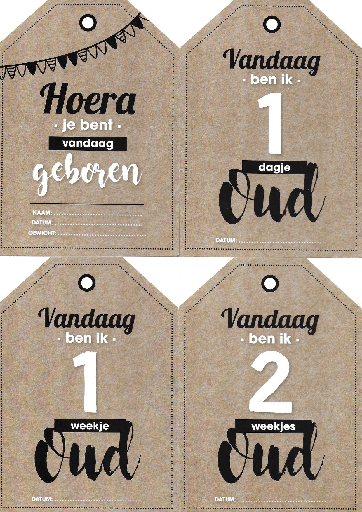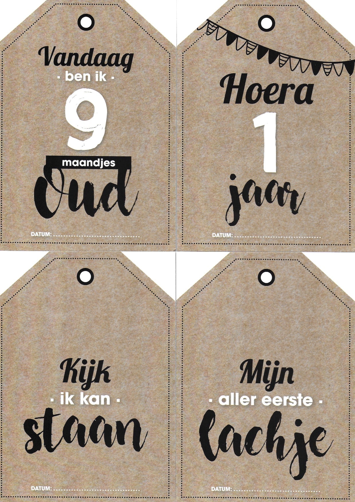 je bent geboren · 1 dagje oud · 1 weekje oud · 2 weekjes oud · 3 weekjes oud · 4 weekjes oud · 3 maandjes oud · 6 maandjes oud · 9 maandjes oud · 1 jaar · ik zei papa · ik zei mama · ik heb doorgeslapen · ik kan lopen · ik kan zitten · ik kan staan · eerste lachje · eerste hapje · eerste kerst · eerste sneeuw · eerste vakantie· eerste tandje · eerste kleertjes